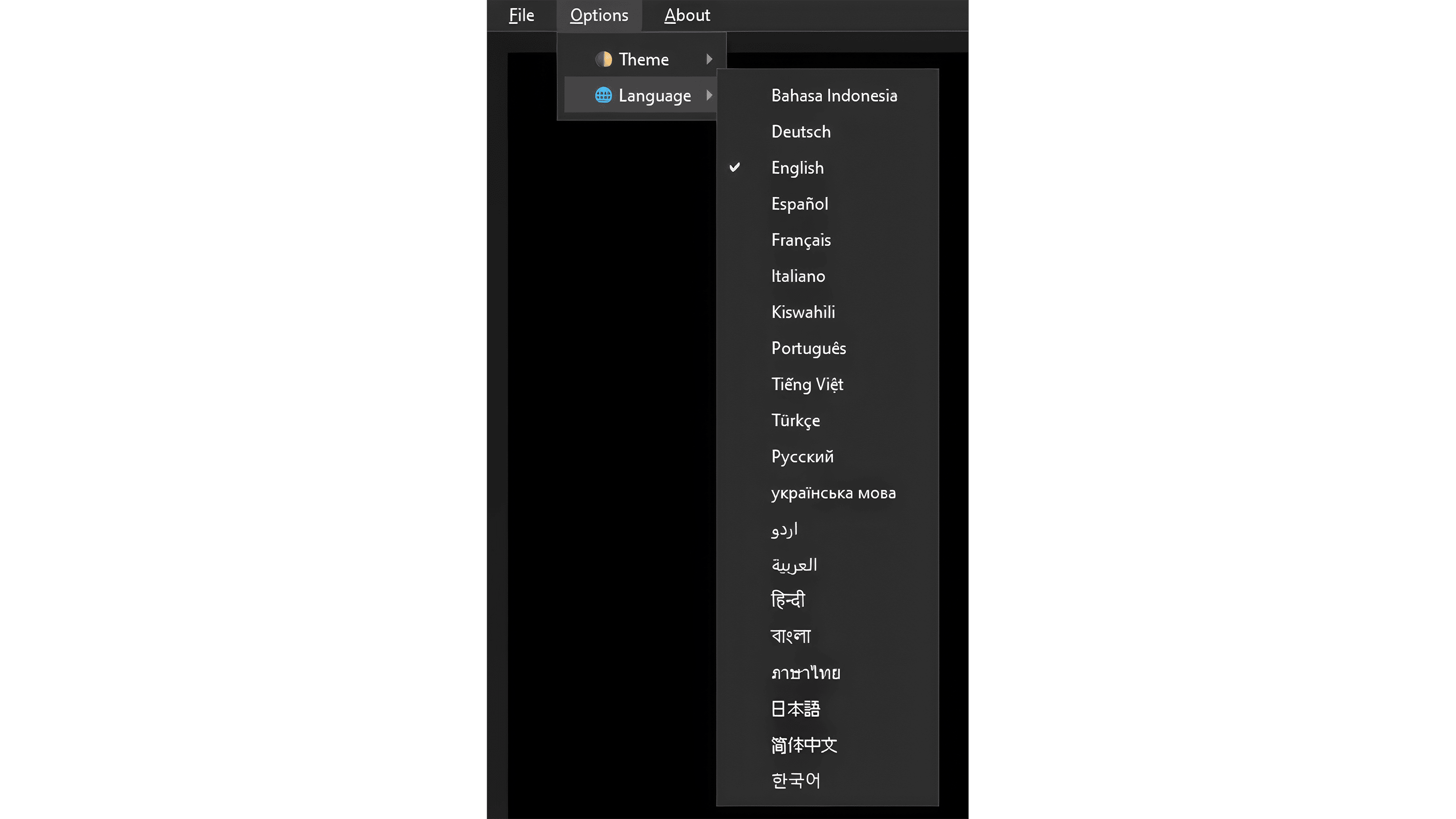 Interface languages: Indonesian, German, English, Spanish, French, Italian, Swahili, Portuguese, Vietnamese, Turkish, Russian, Ukrainian, Urdu, Arabic, Hindi, Bengali, Thai, Korean, Japanese, Simplified Chinese.