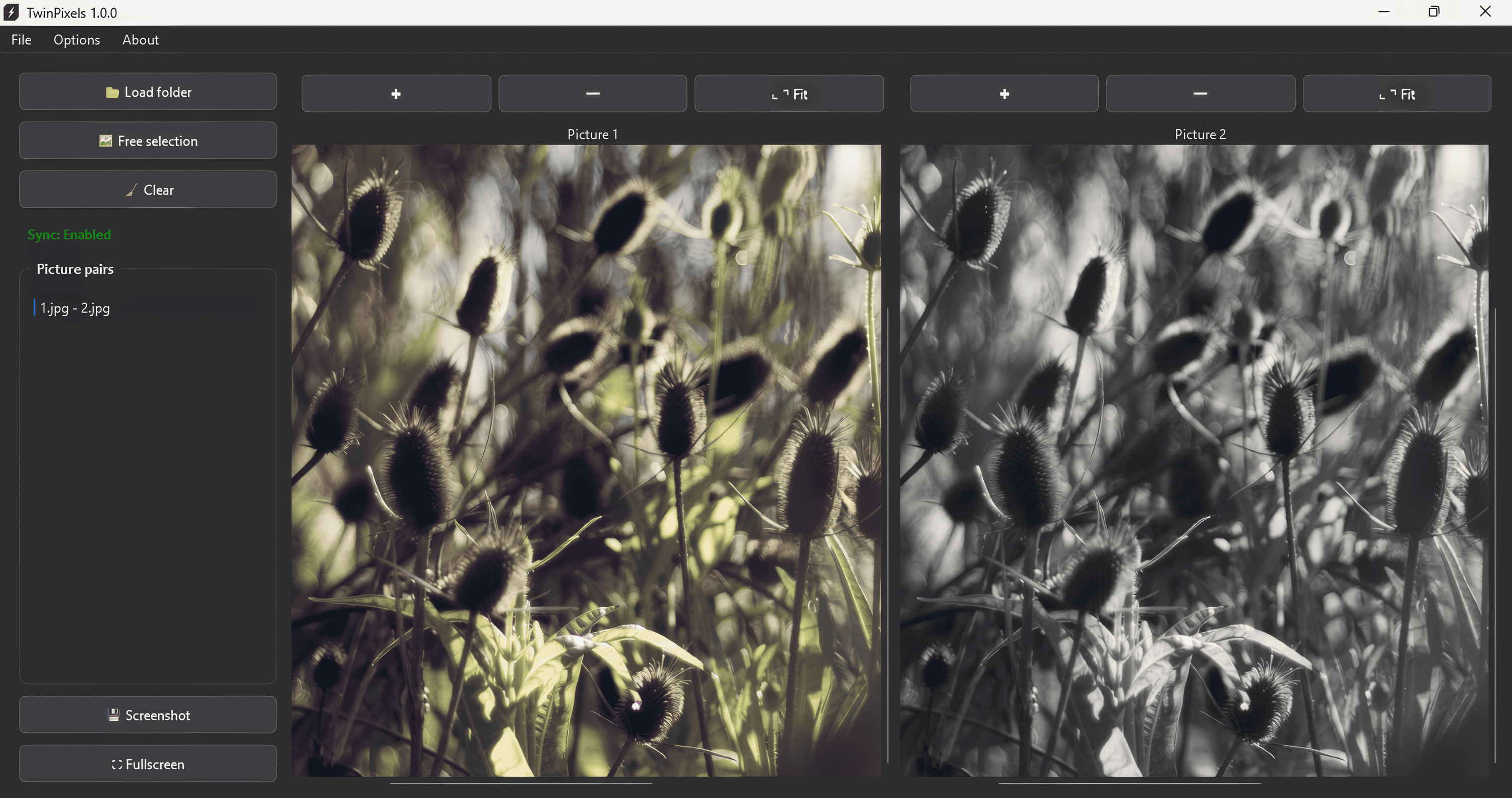 TwinPixels is an application for viewing and comparing images side by side. It allows you to load pairs of images from entire folders or select files manually, and features zoom and synchronized movement functions. You can add multiple pairs of images and save lists for presentations with its full-screen mode and keyboard control.