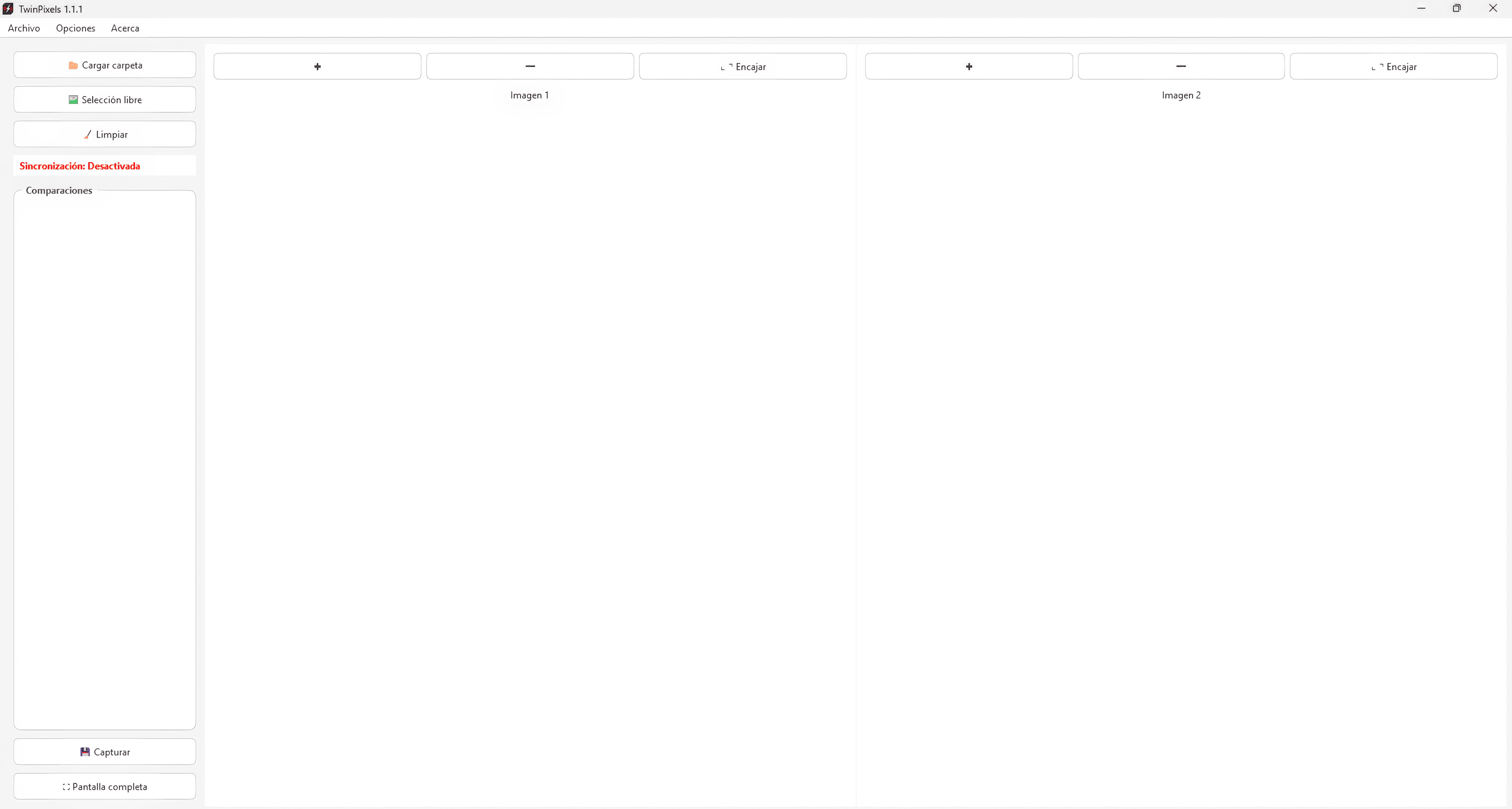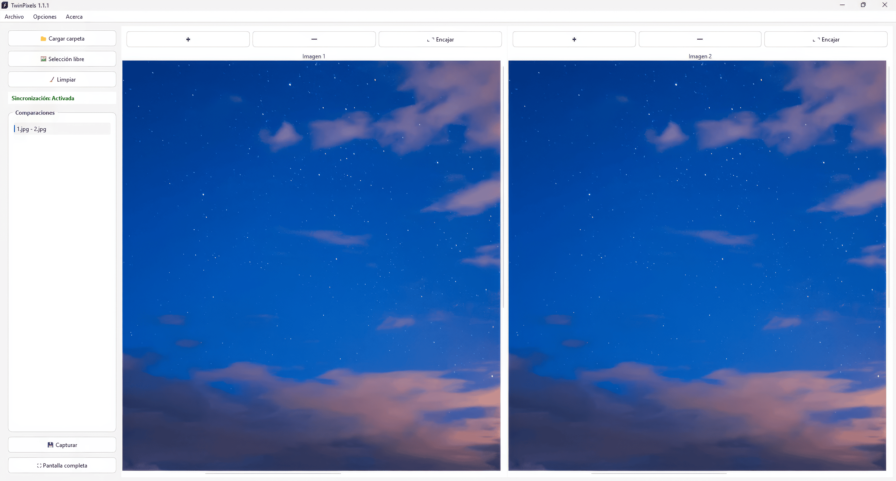 TwinPixels es una aplicación para visualizar y comparar imágenes lado a lado. Permite cargar pares de imágenes desde carpetas completas o seleccionar los archivos manualmente, cuenta con funciones de zoom y movimiento sincronizado. Puede añadir múltiples pares imágenes y guardar listas para presentaciones con su modo de pantalla completa y control con el teclado.